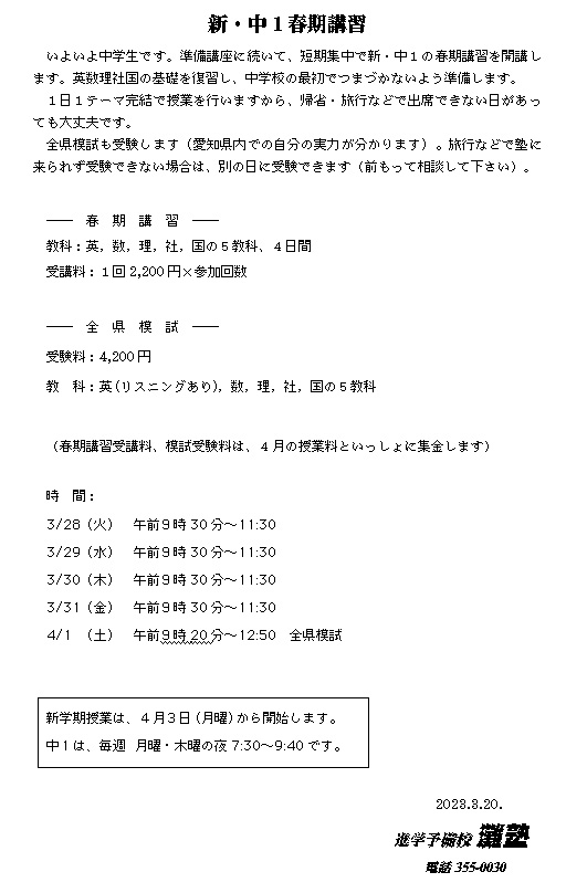 冬期講習←暫定(変更する可能性あり)